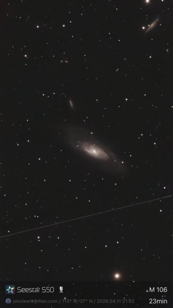 First night in St. George. Got the Seestar S50 out and locked onto M106, a spiral galaxy about 25 million light years away. 23 minutes of exposure. What I didn't realize until I pulled up the image was that two other galaxies ended up in the frame — NGC 4217 is the edge-on one in the upper right corner, and NGC 4248 is the smaller one above M106. Not a bad way to start the trip. There's a satellite trail across the bottom too, which is kind of annoying but also kind of cool.